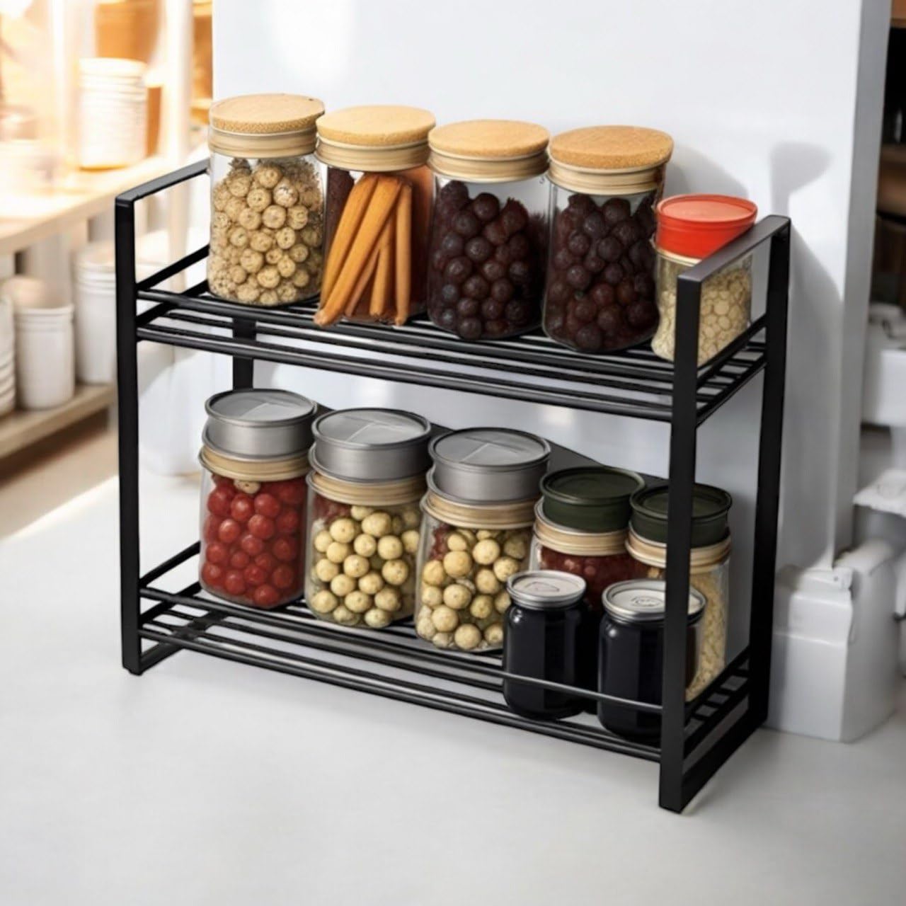 • Strong & Durable Iron Build – Made from sturdy black iron, this rack is built to last and handle the weight of multiple jars and bottles.